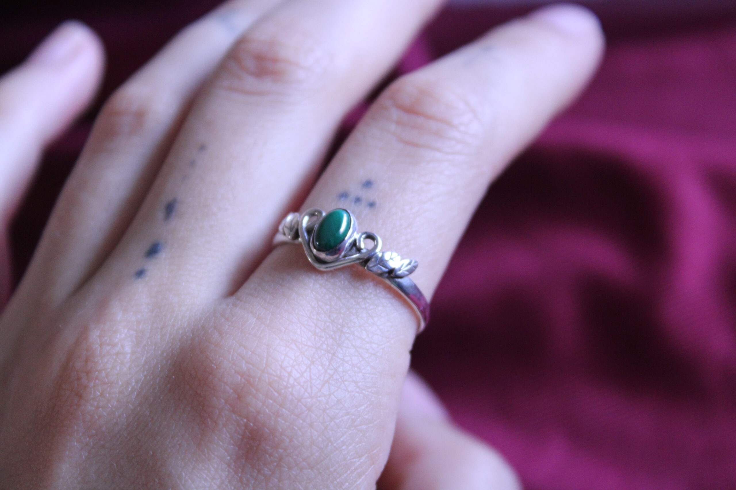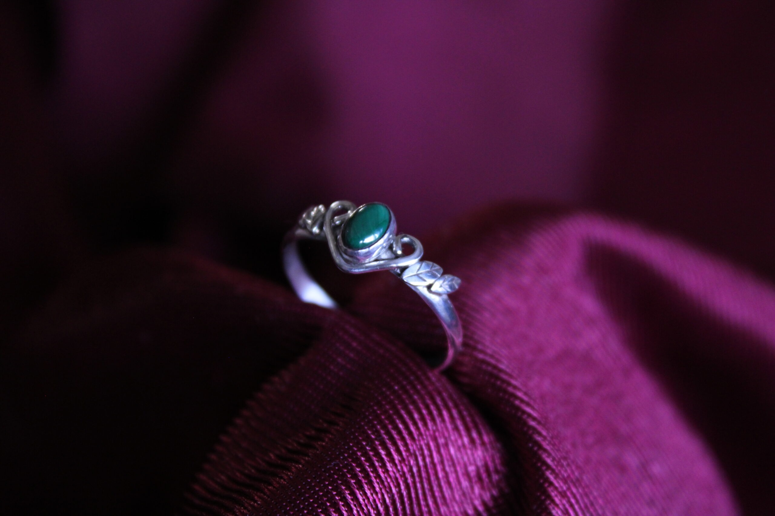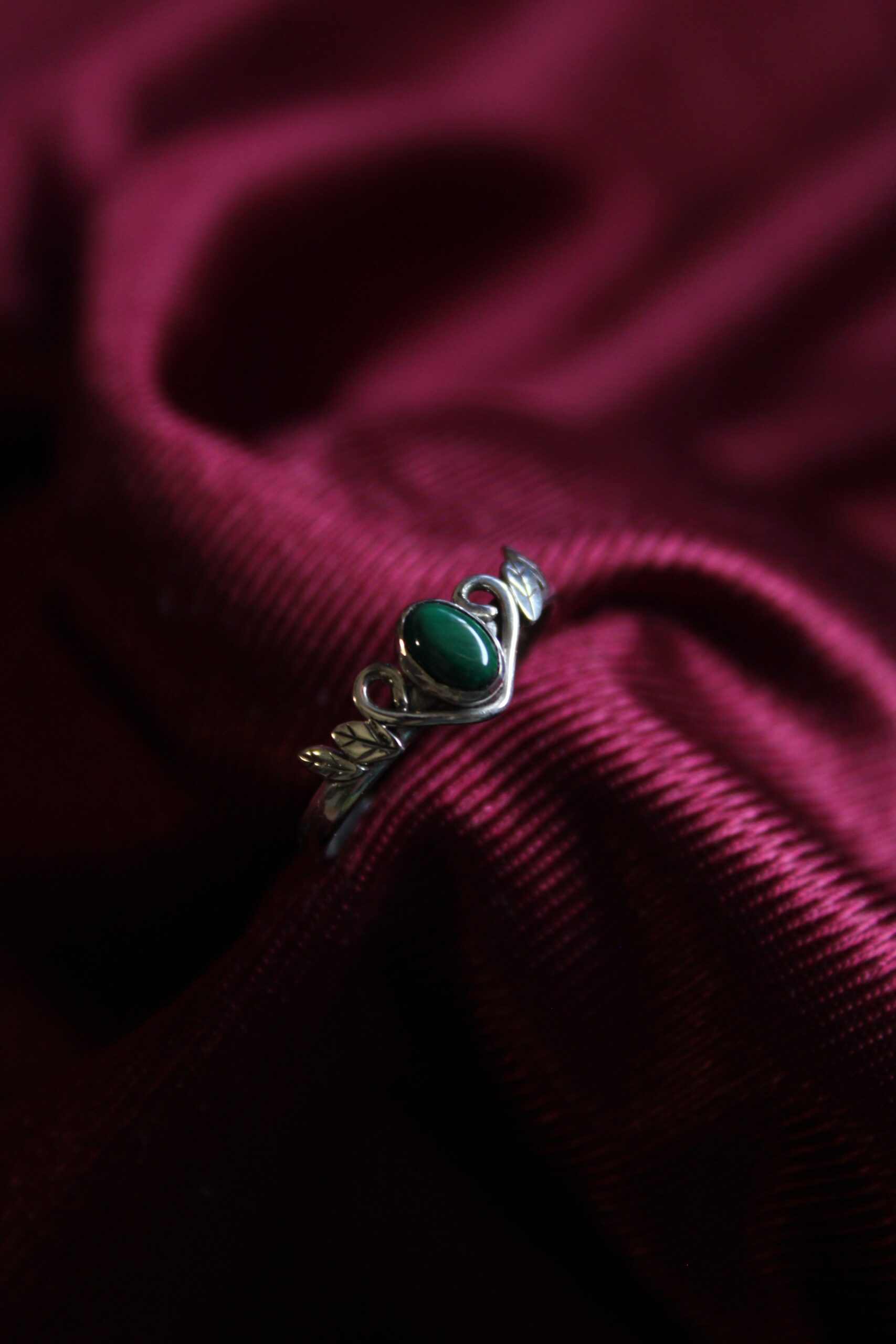 Un anillo confeccionado artesanalmente por mí, con plata 925 y una piedra verde conocida como Malaquita en la parte central. Este anillo nació con la idea de crear nuevas joyas centradas en el estilo élfico que tanto nos gusta.