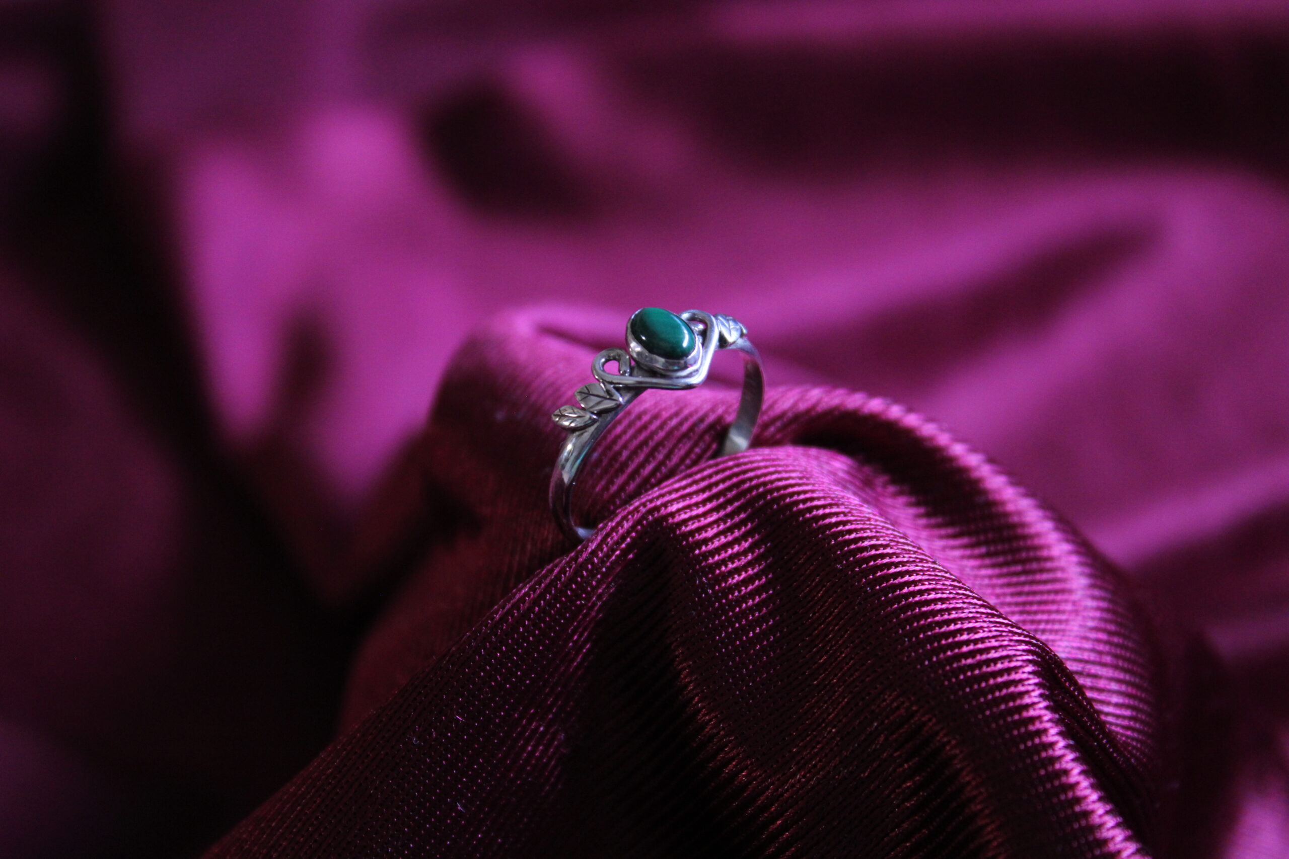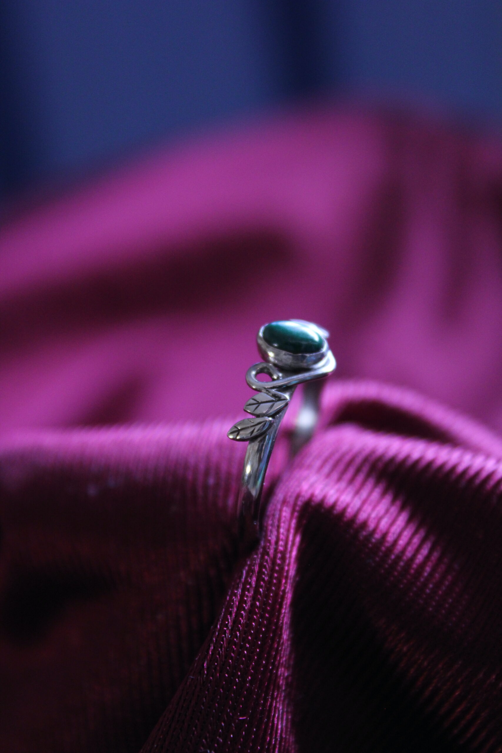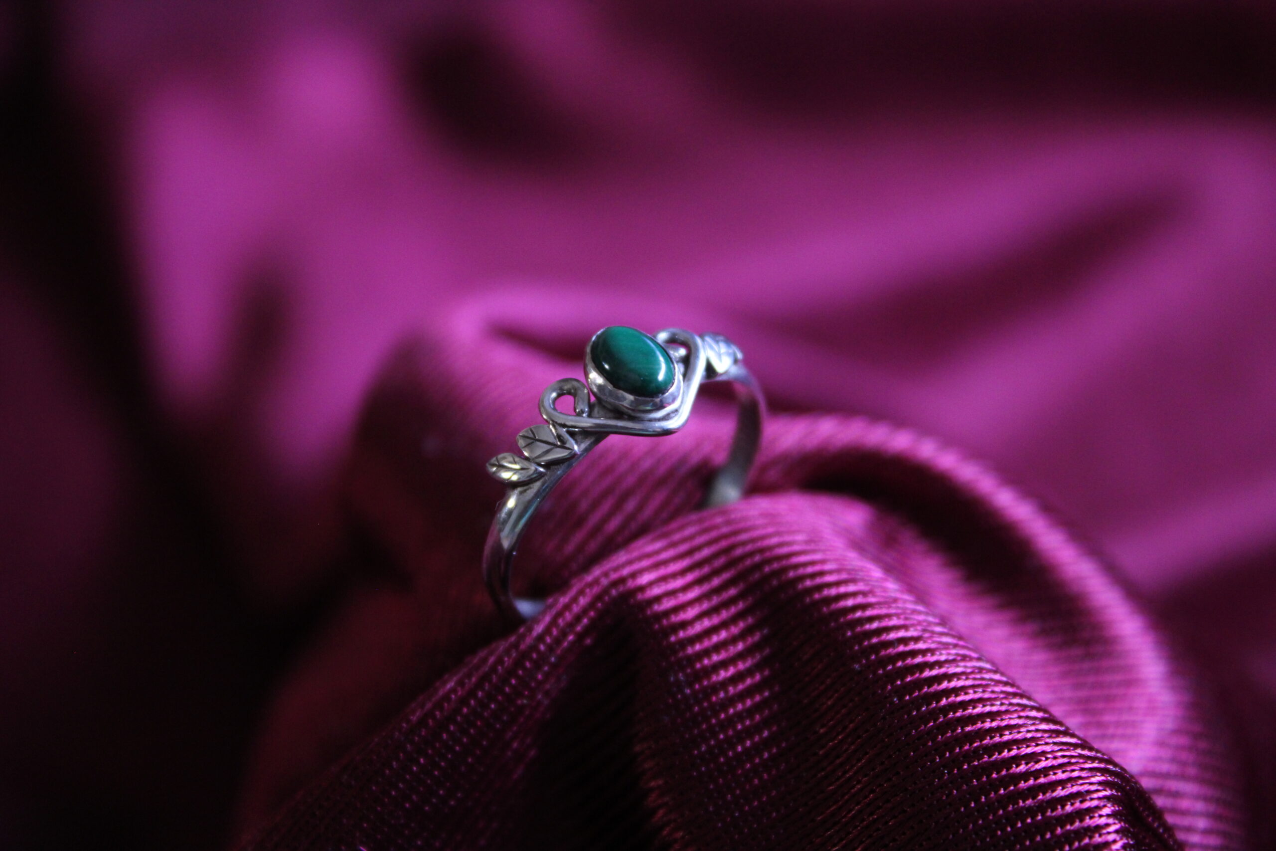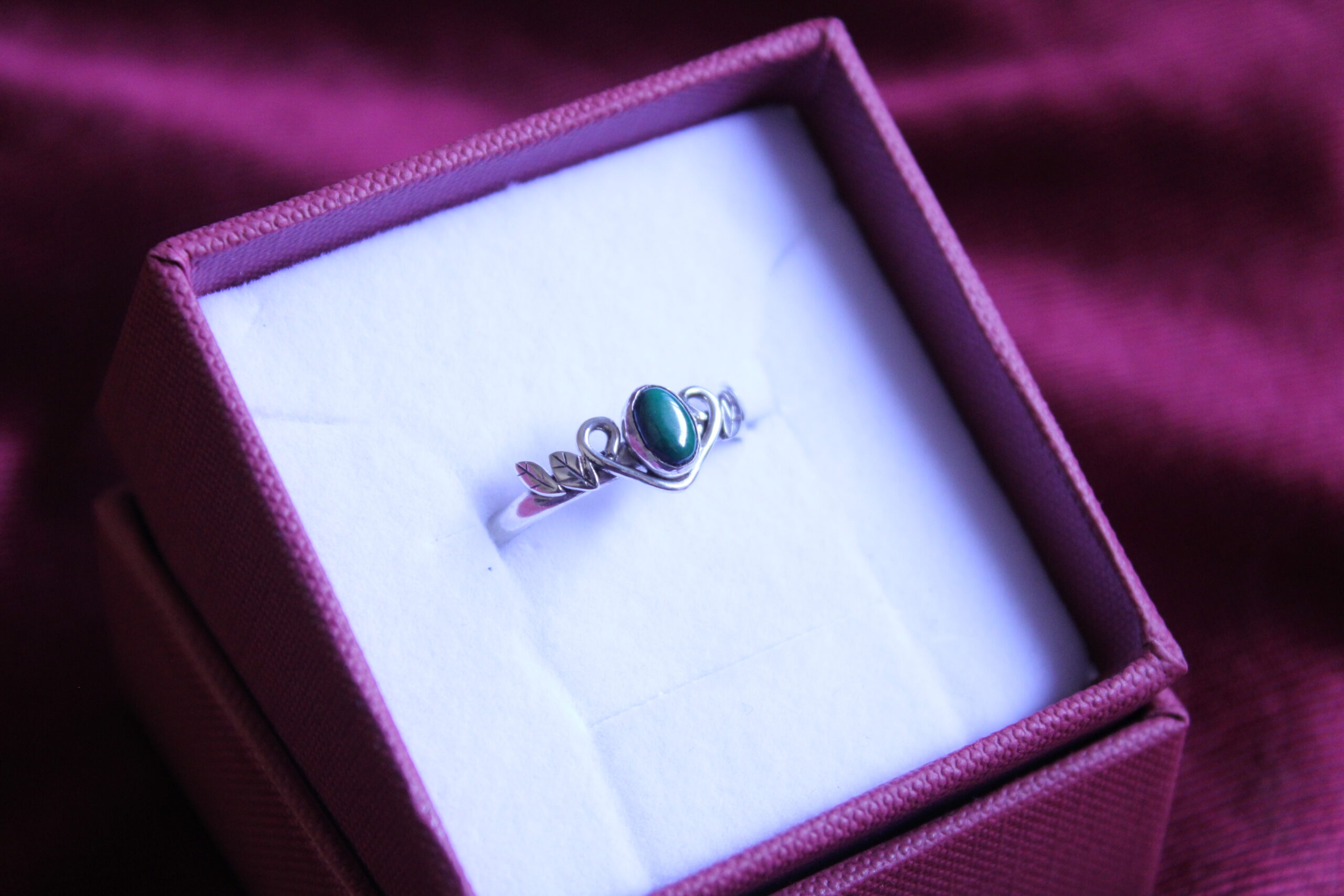 Un anillo confeccionado artesanalmente por mí, con plata 925 y una piedra verde conocida como Malaquita en la parte central. Este anillo nació con la idea de crear nuevas joyas centradas en el estilo élfico que tanto nos gusta.