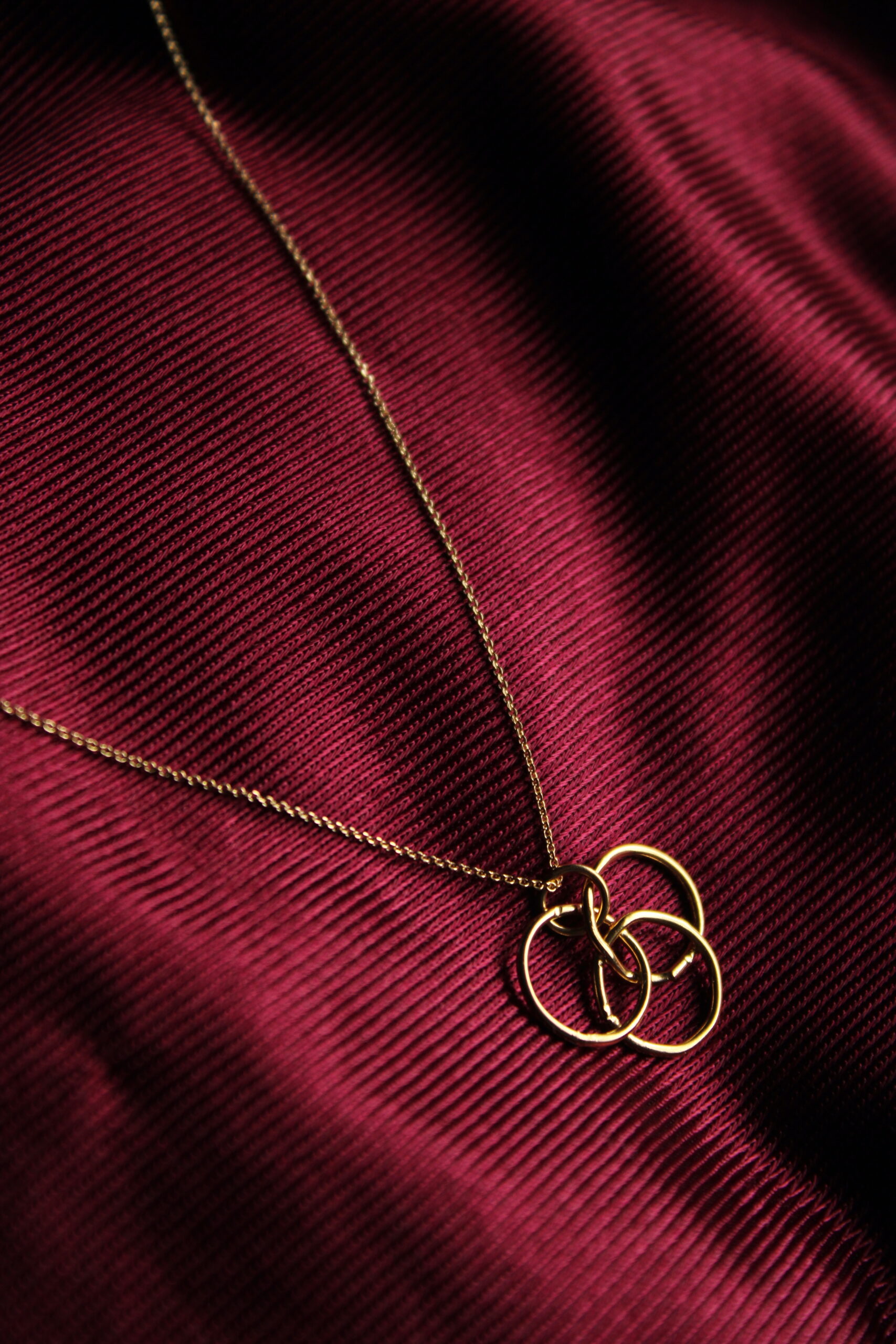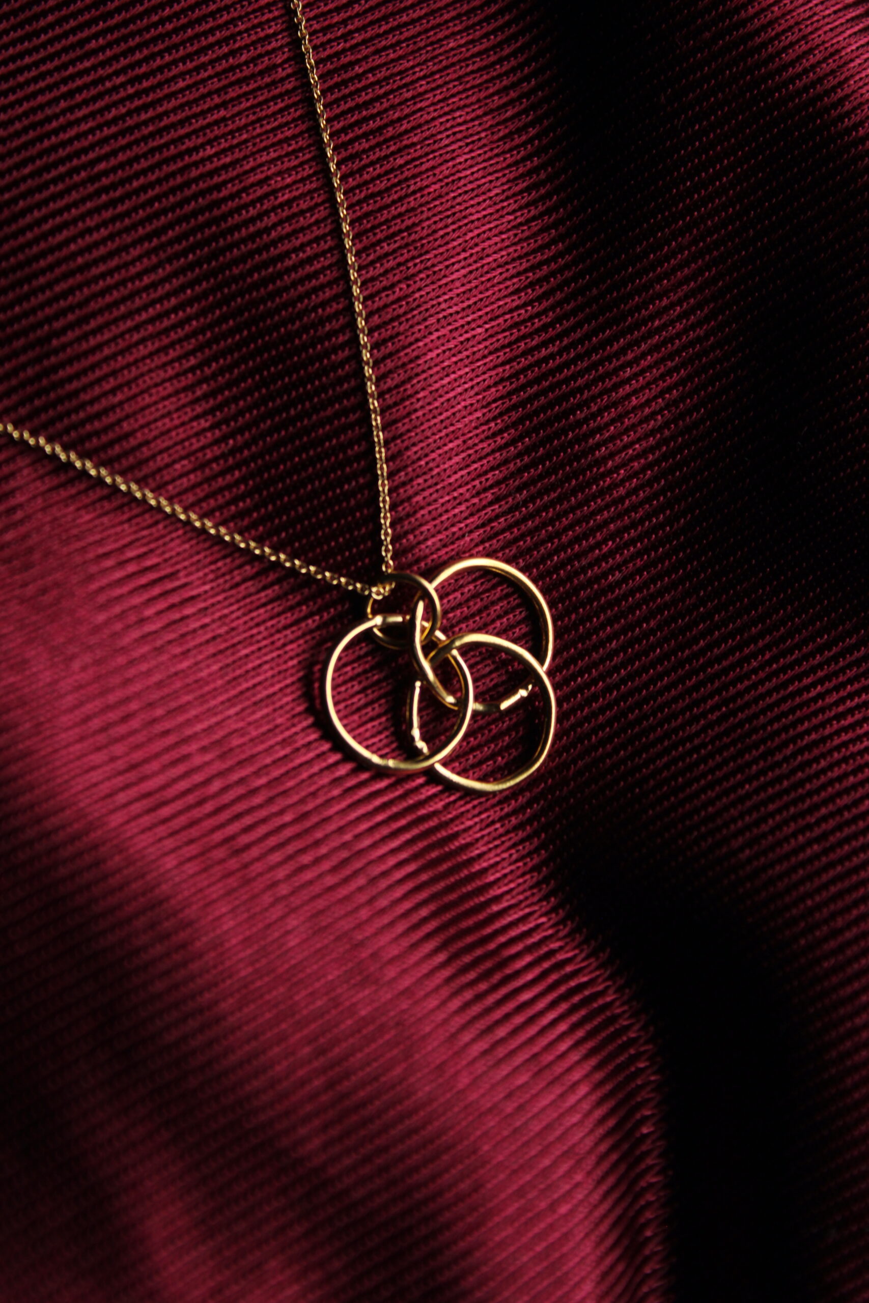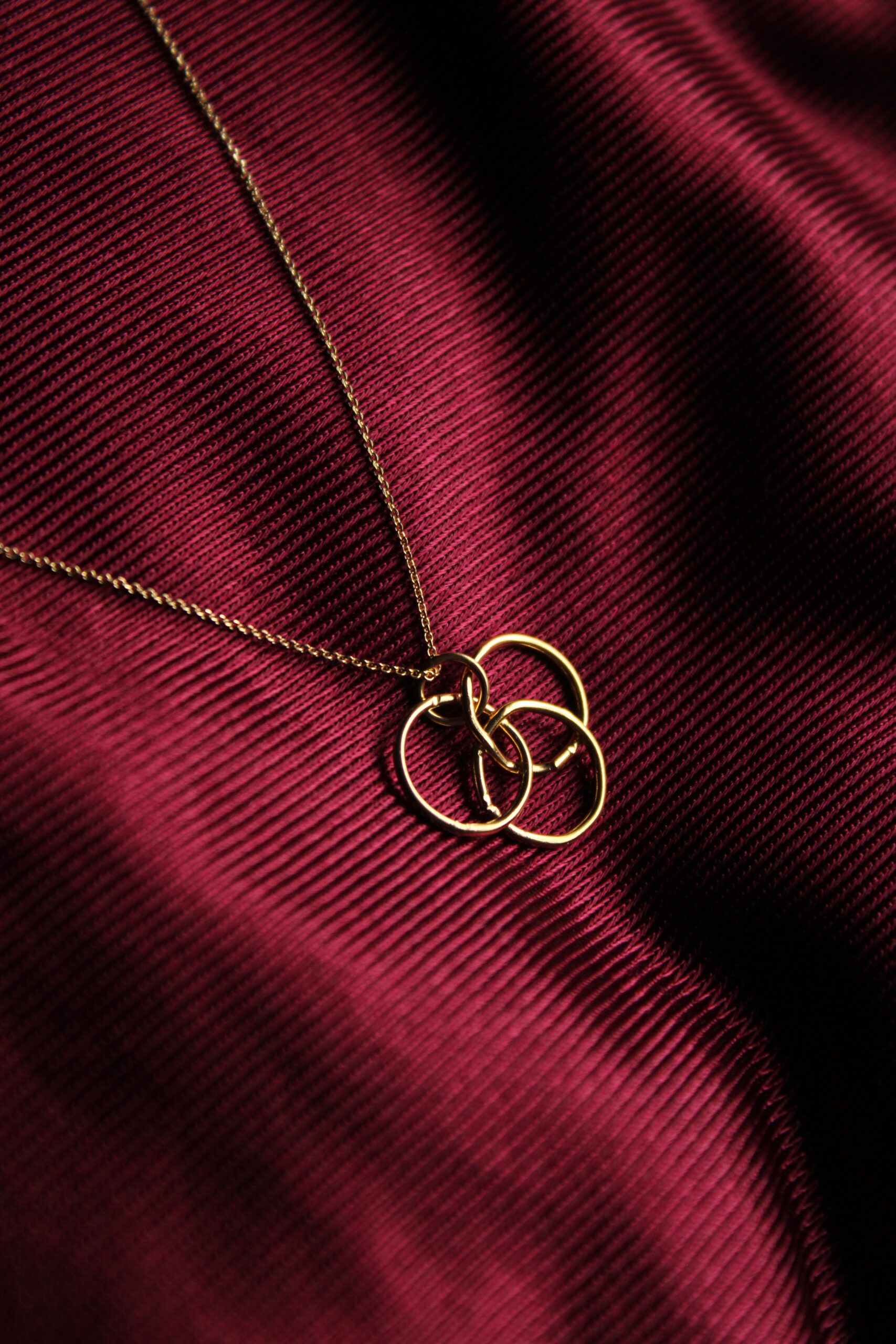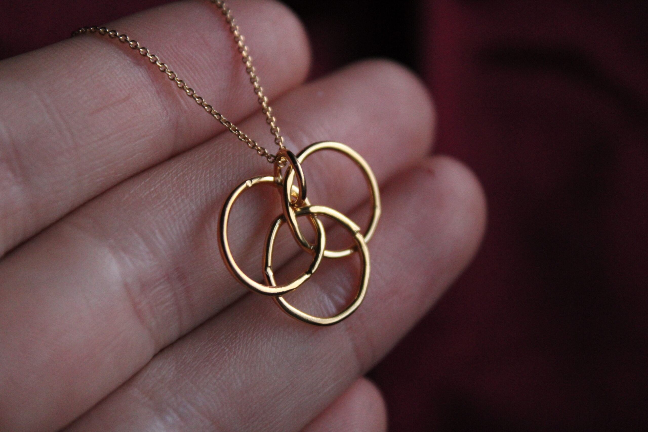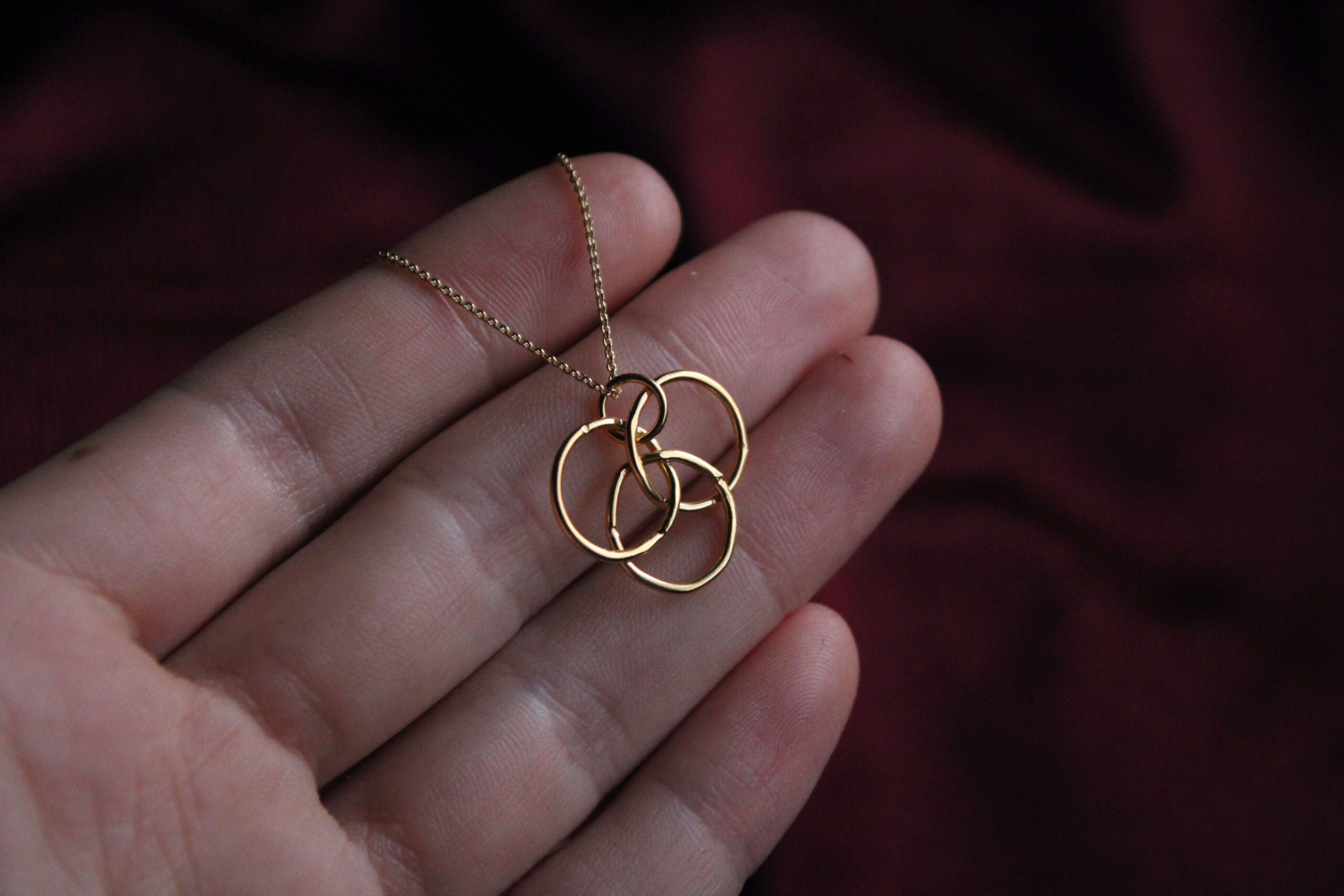 Hecho a mano creando tres círculos entrelazados. Es plata de ley 925 bañado en oro de 24k. Cadena de plata bañada en oro opcional de 45cm. Creado artesanalmente e inspirado en el amuleto Arlesiano que viste Bryce en los libros de Ciudad Medialuna.