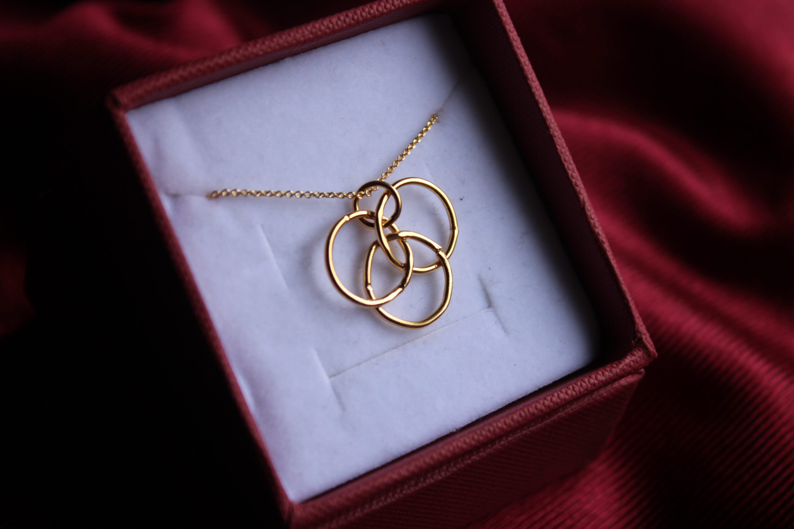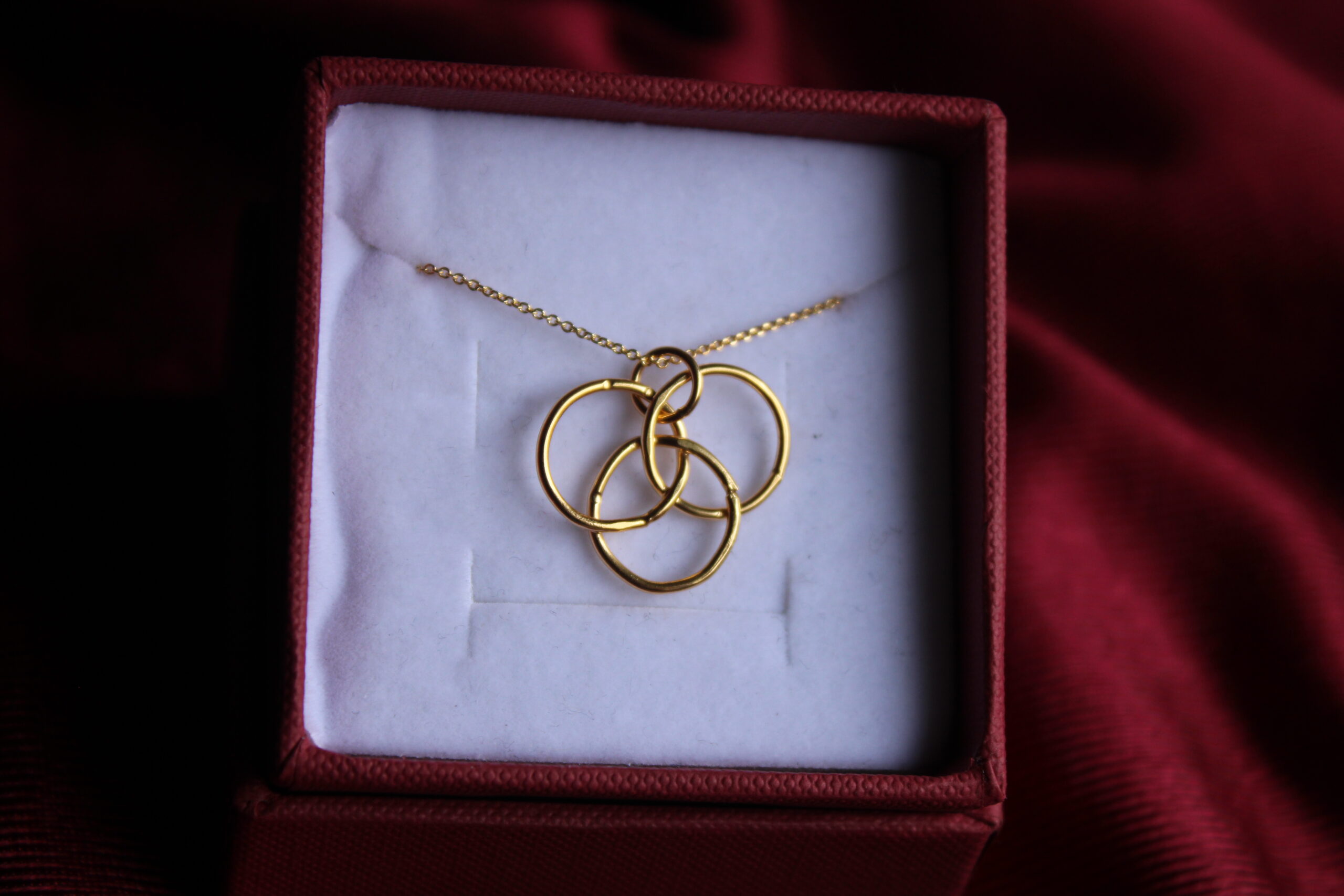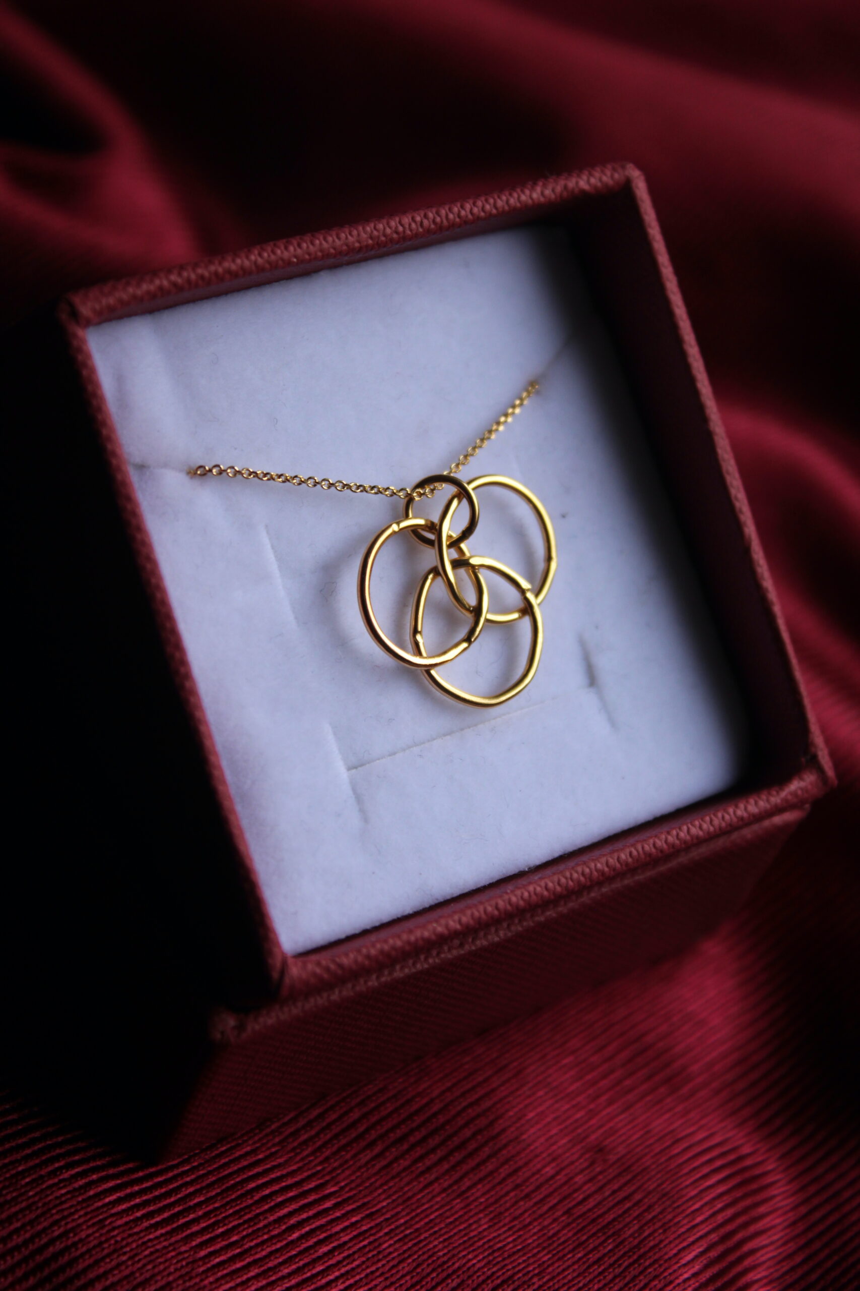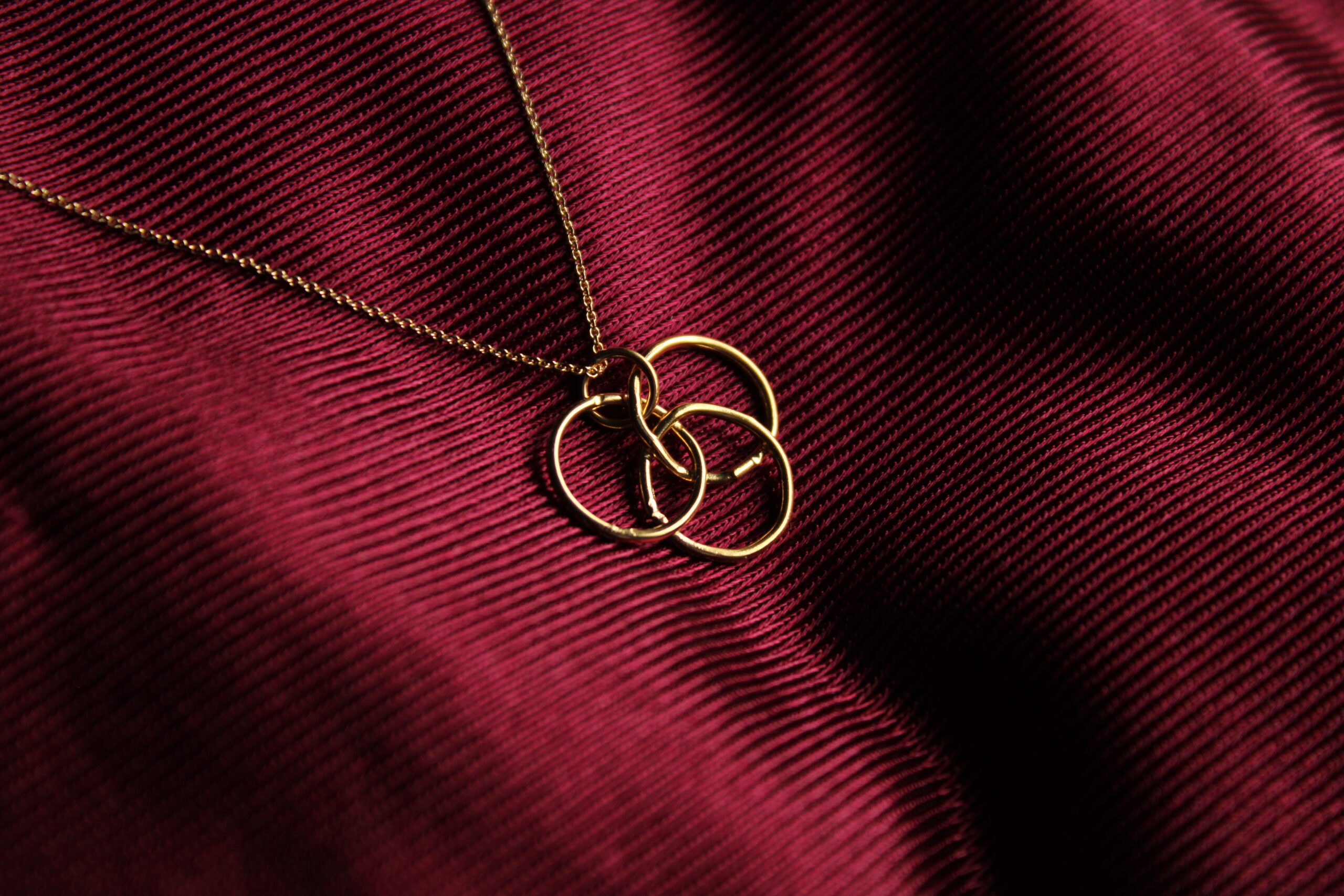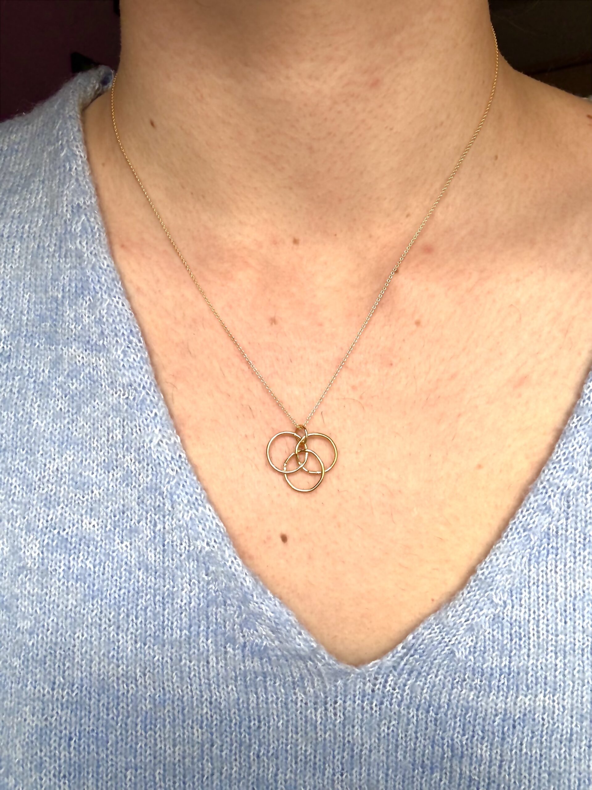 Hecho a mano creando tres círculos entrelazados. Es plata de ley 925 bañado en oro de 24k. Cadena de plata bañada en oro opcional de 45cm. Creado artesanalmente e inspirado en el amuleto Arlesiano que viste Bryce en los libros de Ciudad Medialuna.