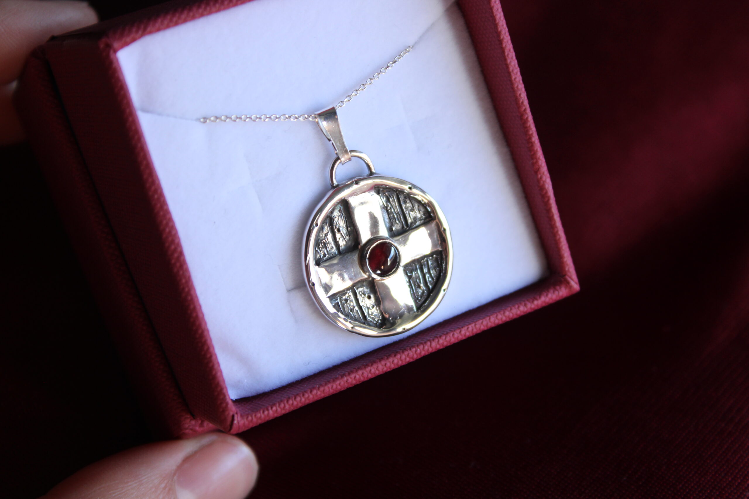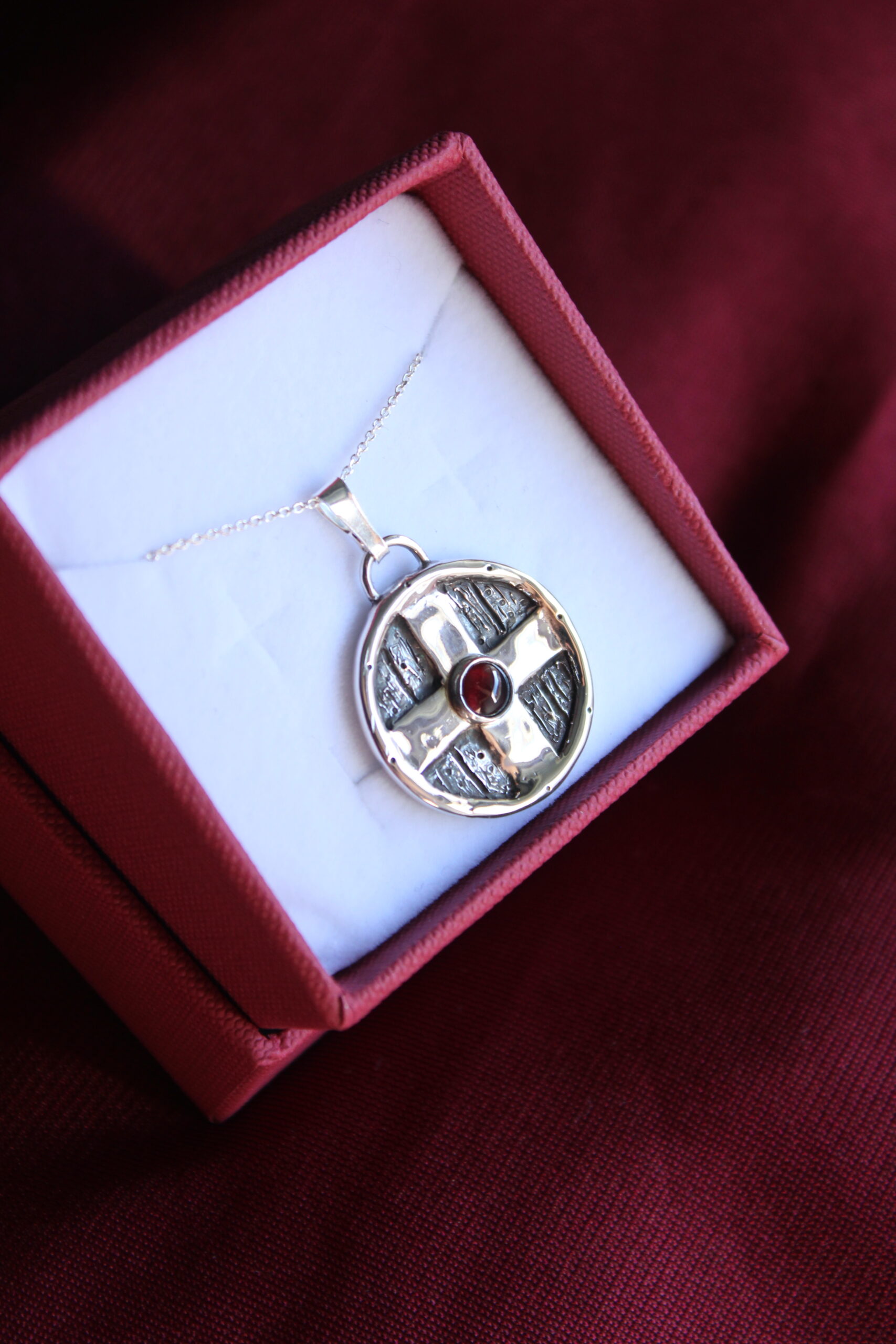 Colgante Escudo Vikingo de Plata con Granate – Joyería Artesanal Nórdica