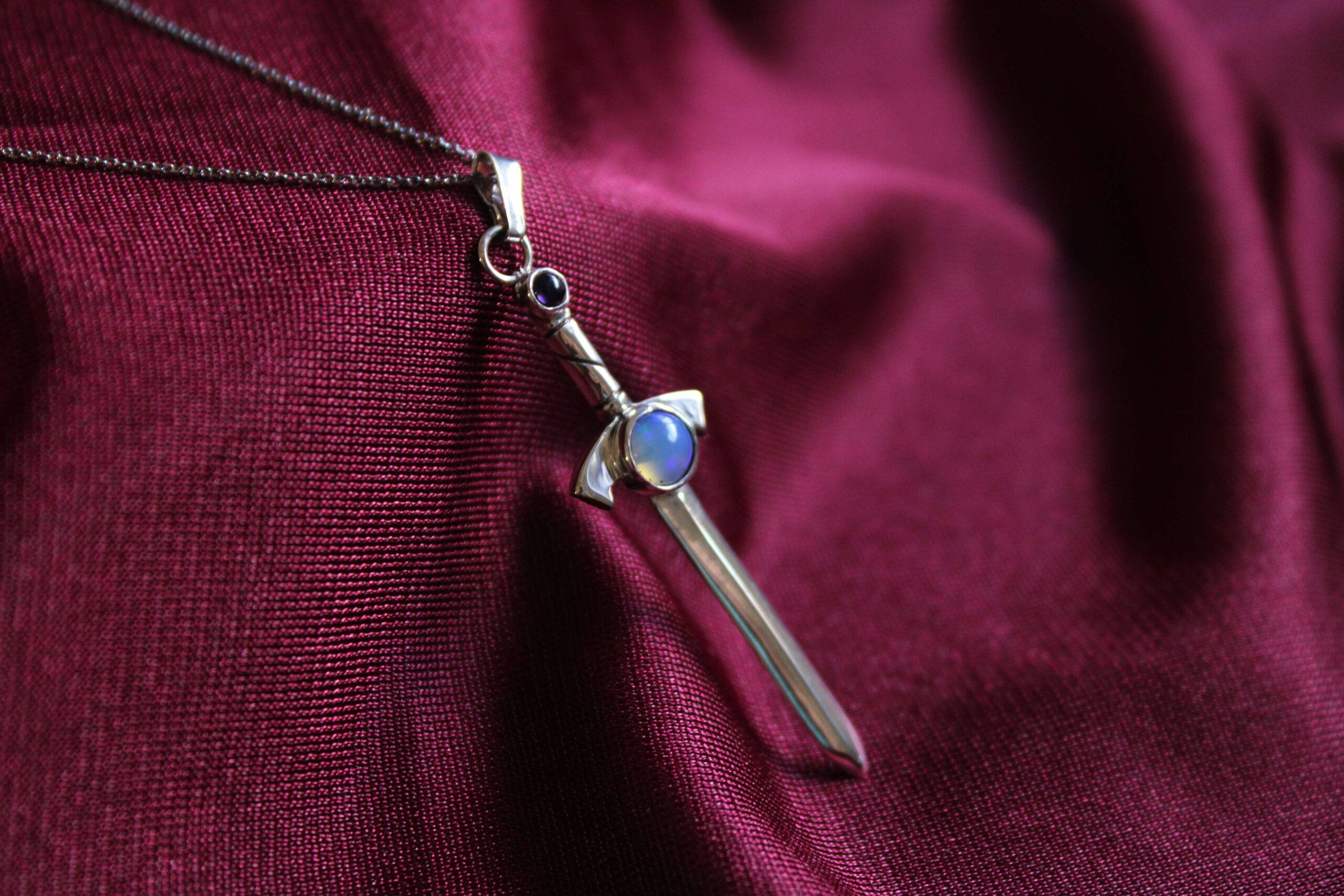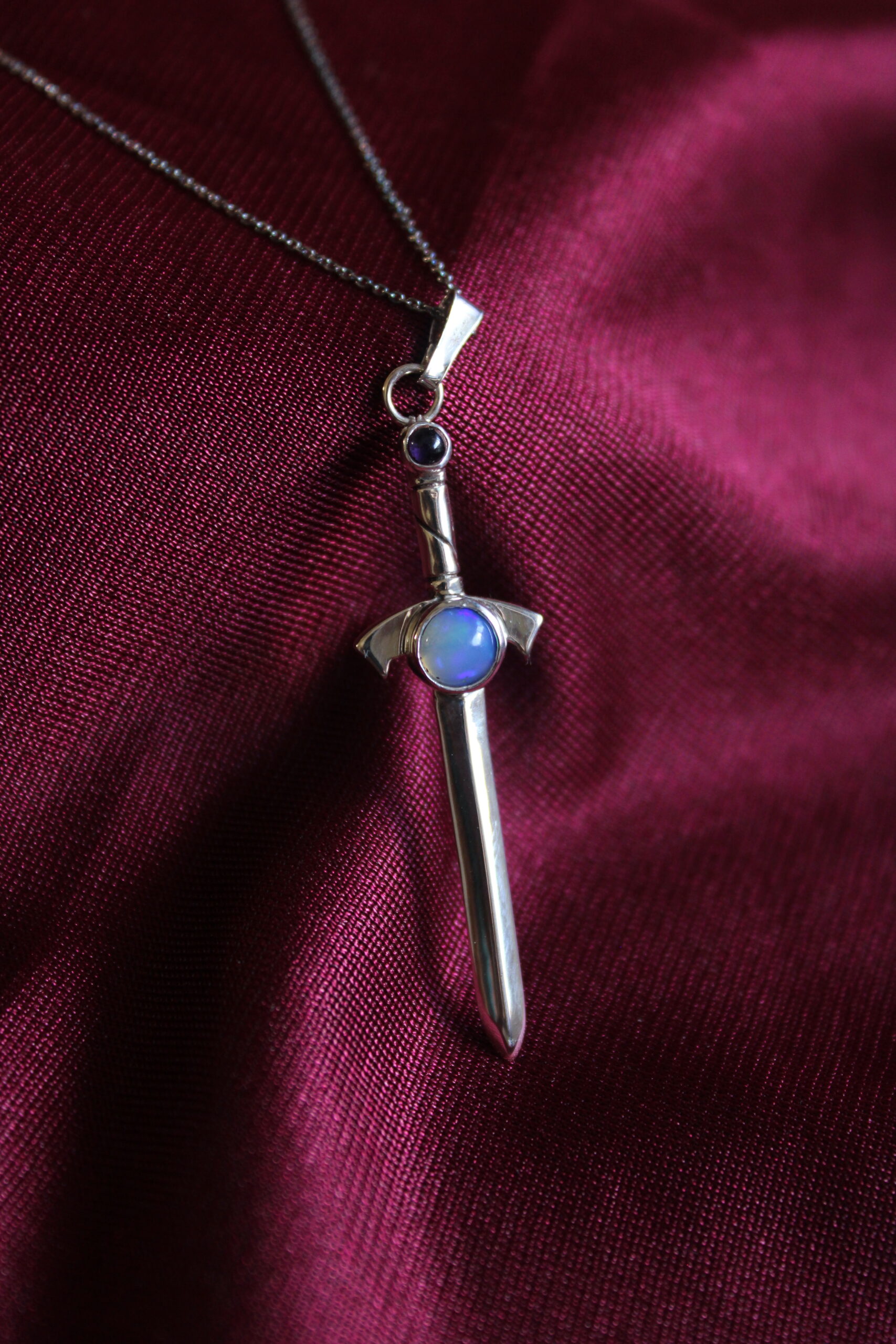 Hecha a mano con alma de forja y pasión por el detalle, esta espada de plata lleva un impresionante ópalo etíope de calidad alta que enamora con todos sus destellos coloridos. Y junto a una pequeña amatista en el pomo, es una joya destinada a almas divertidas y alegres, ayuda a afrontar la vida con una sonrisa.