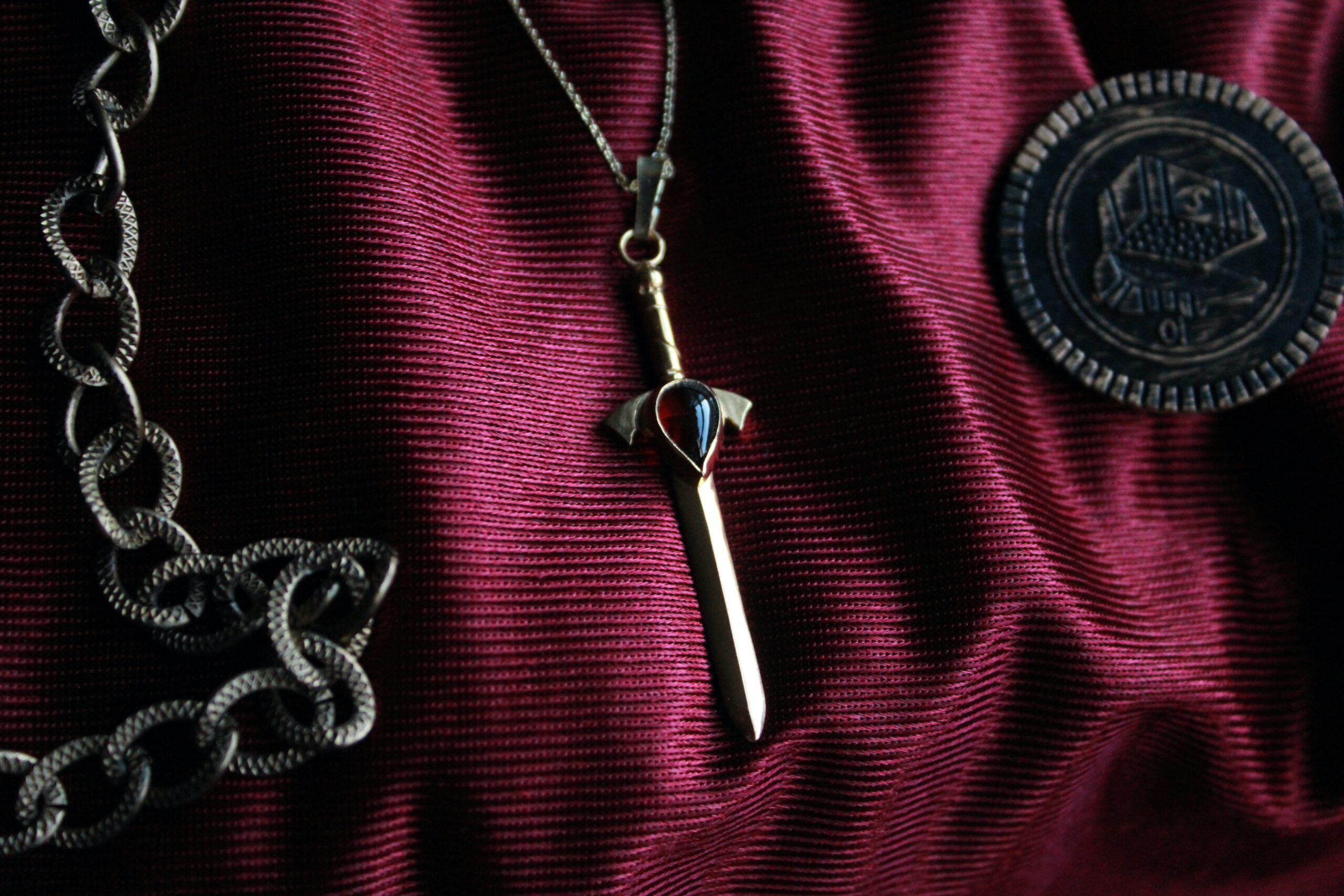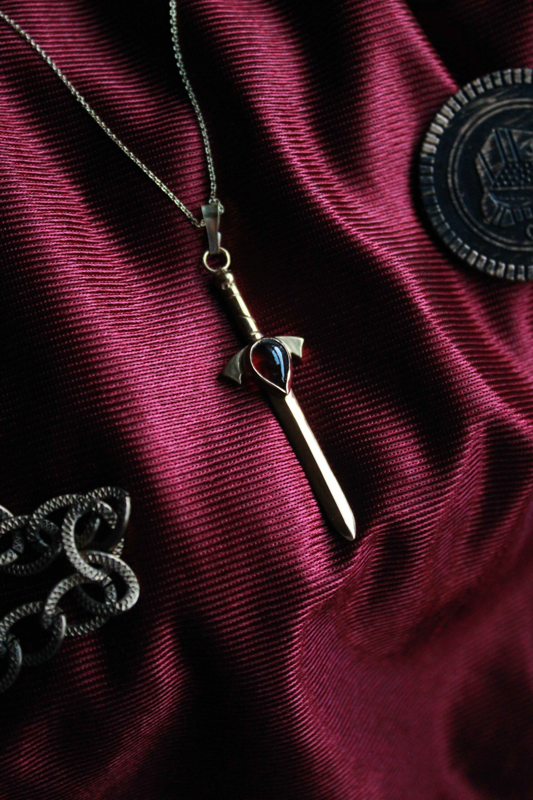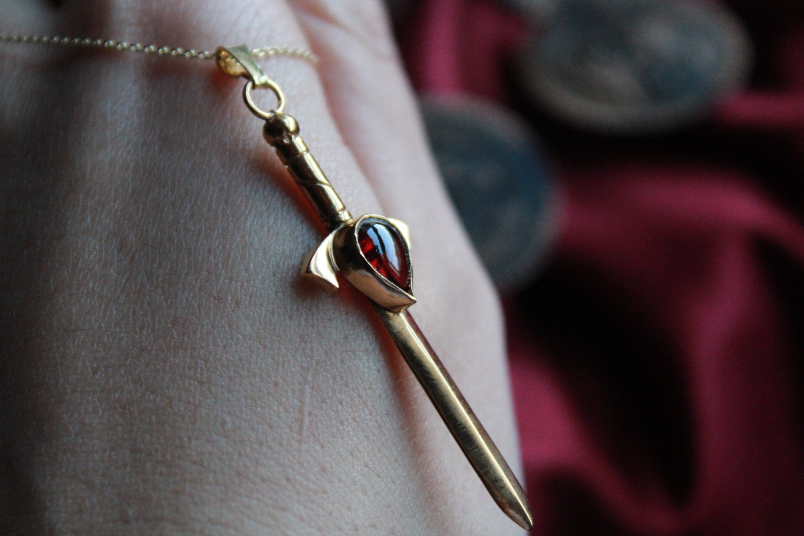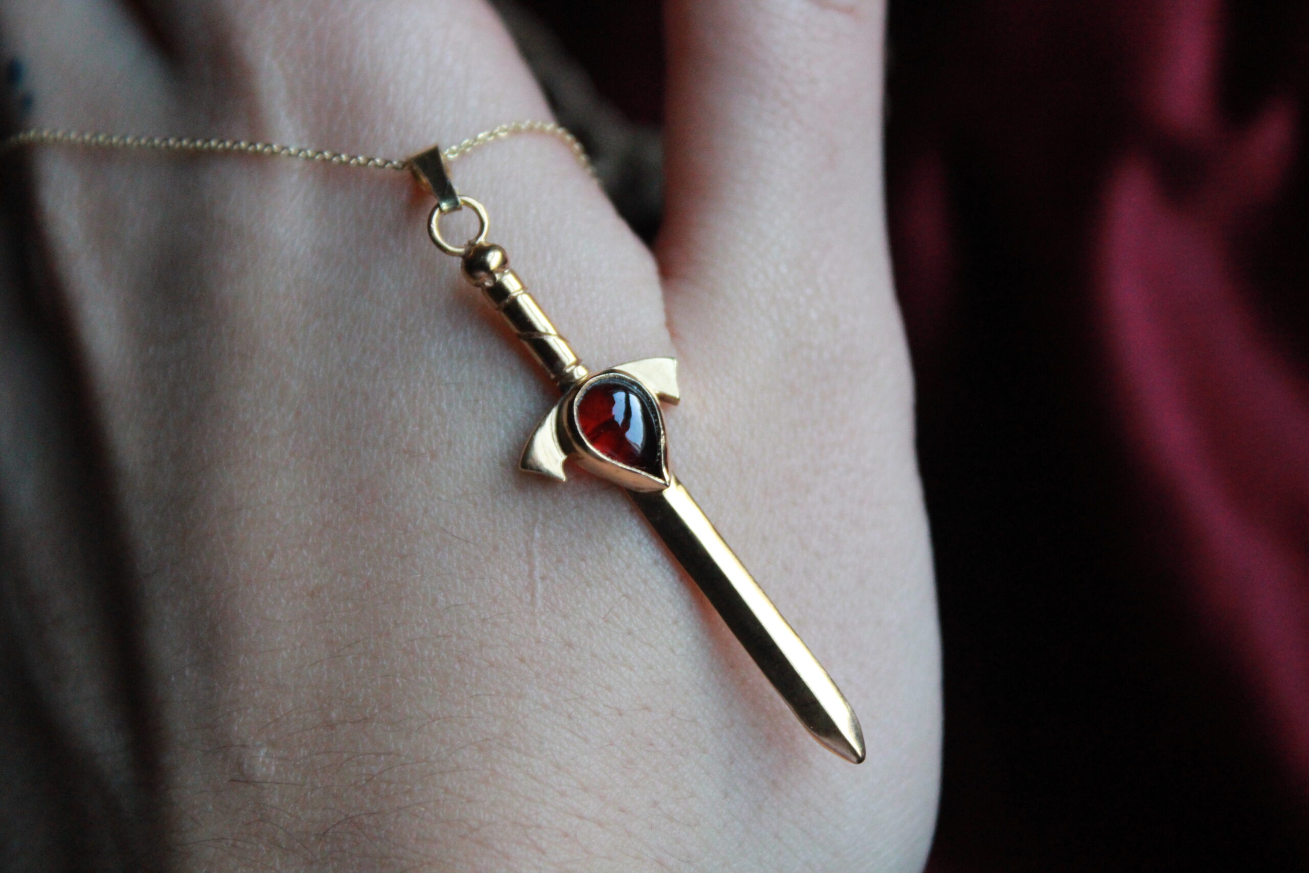 Este elegante colgante en forma de espada es una obra preciosa artesanal. Forjado en plata de ley y meticulosamente bañado en oro amarillo, combina la resistencia de los metales nobles con la calidez de un acabado dorado. En el centro de la espada, una piedra natural de granate brilla intensamente, evocando fuerza, pasión y energía protectora. Su diseño único y lleno de detalles lo convierte en una pieza ideal para quienes buscan un accesorio distintivo con un aire poderoso y sofisticado. Perfecto para complementar cualquier look o como regalo especial para alguien que aprecia la exclusividad y el simbolismo. ¡Lleva contigo el espíritu de la valentía y la elegancia!